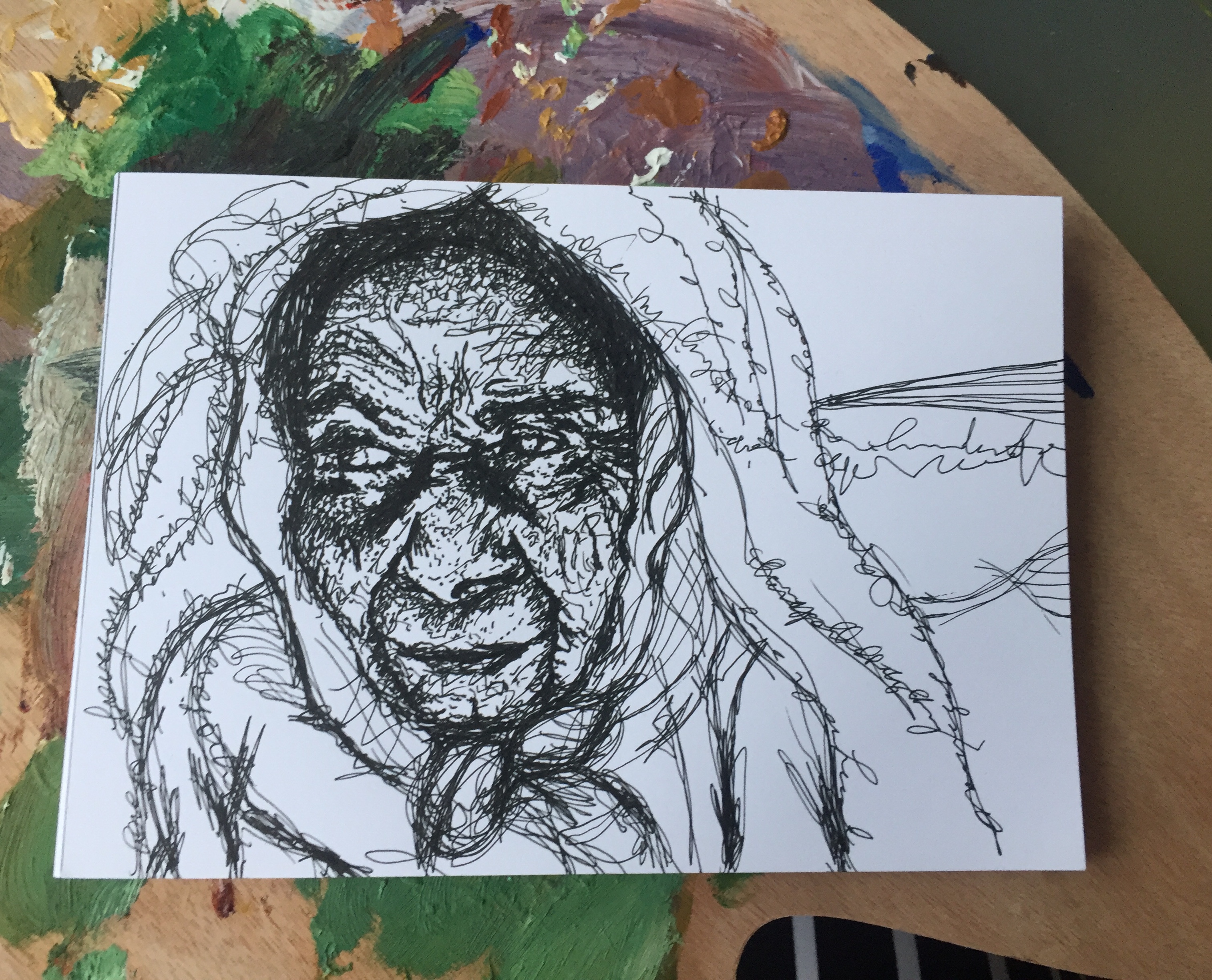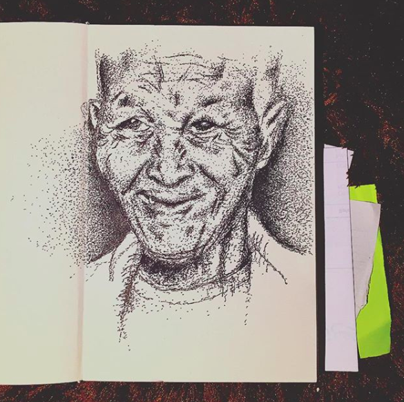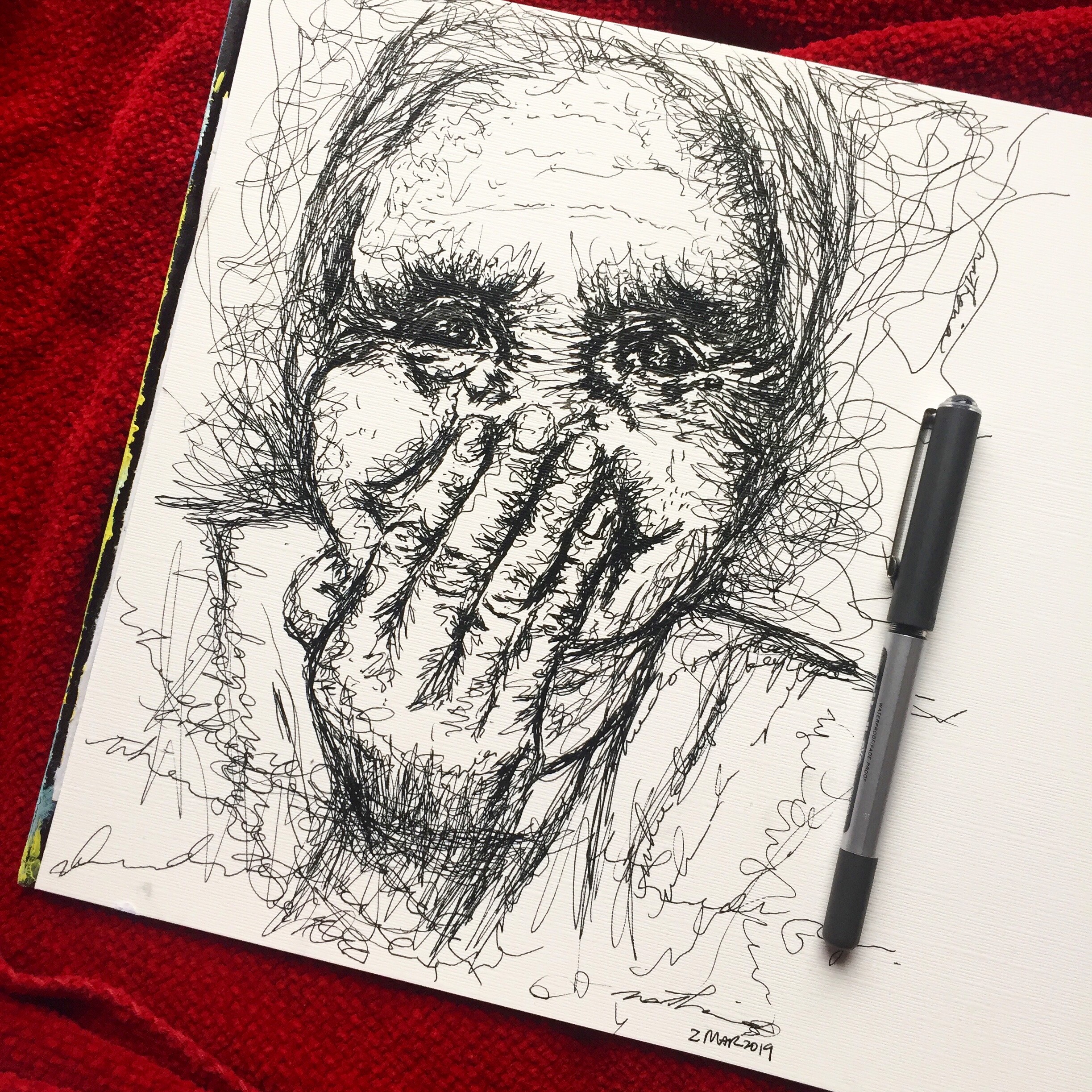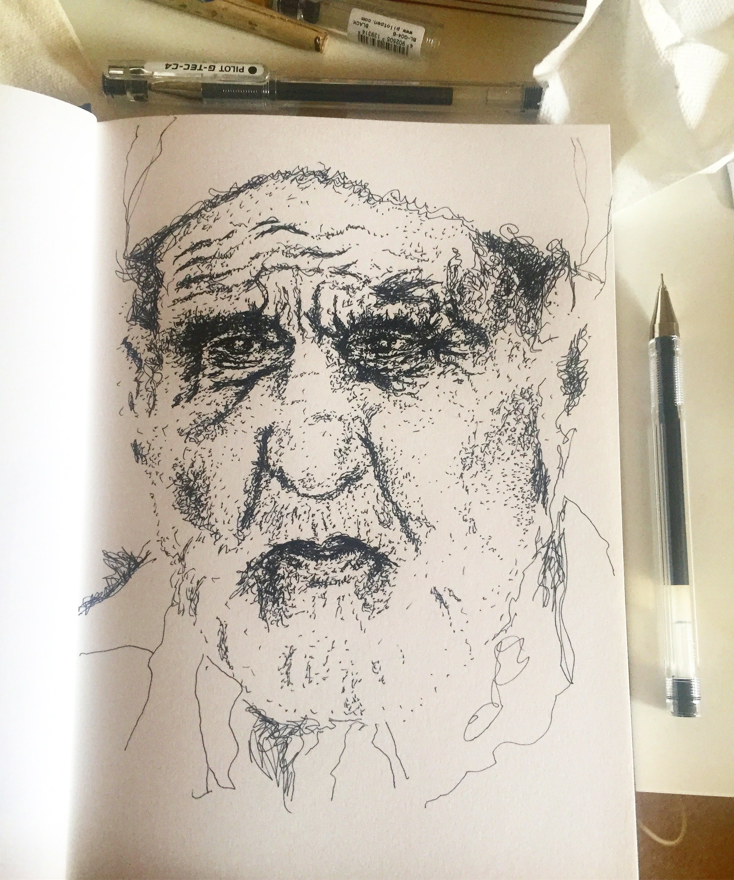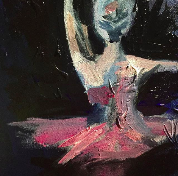 I work with oil paint, pen, charcoal, chalk, pastel, and pencil.